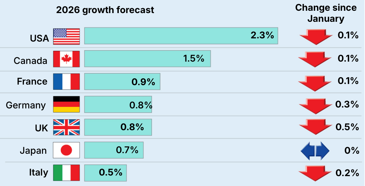 The International Monetary Fund (IMF) - ‘An organisation that monitors the financial health of 190+ countries’ - downgraded the growth forecasts for 2026 across all the G7 countries, with the UK seeing the steepest cuts amongst the top nations. 1.3% growth now down to 0.8% (-0.5%). What this could mean for you:
